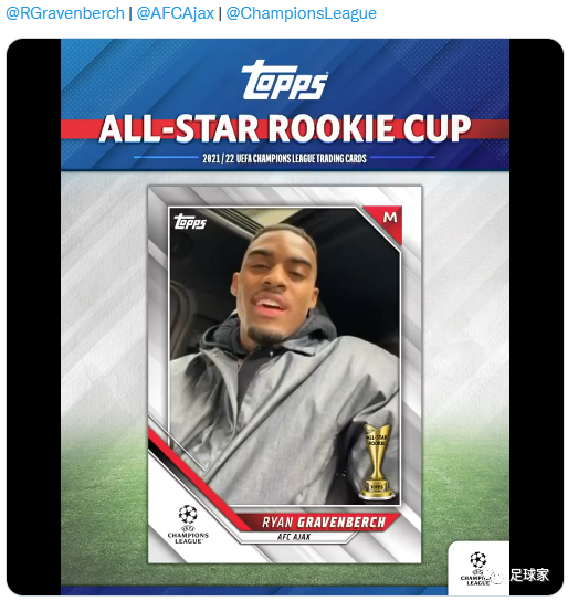 至于全明星新秀的名单,则是既在这次Topps 2021-22欧冠200人的基础名单内、同时又在去年Topps 2020-21欧冠系列中作为RC出现过,并且还是上赛季表现优异的“老新秀”球员。当然,为了区别于传统的有RC标记的元年新秀,这些全明星新秀球员们,都会以另一种形式标记出来——带有All-Star Rookie(全明星新秀)字样的奖杯图标。