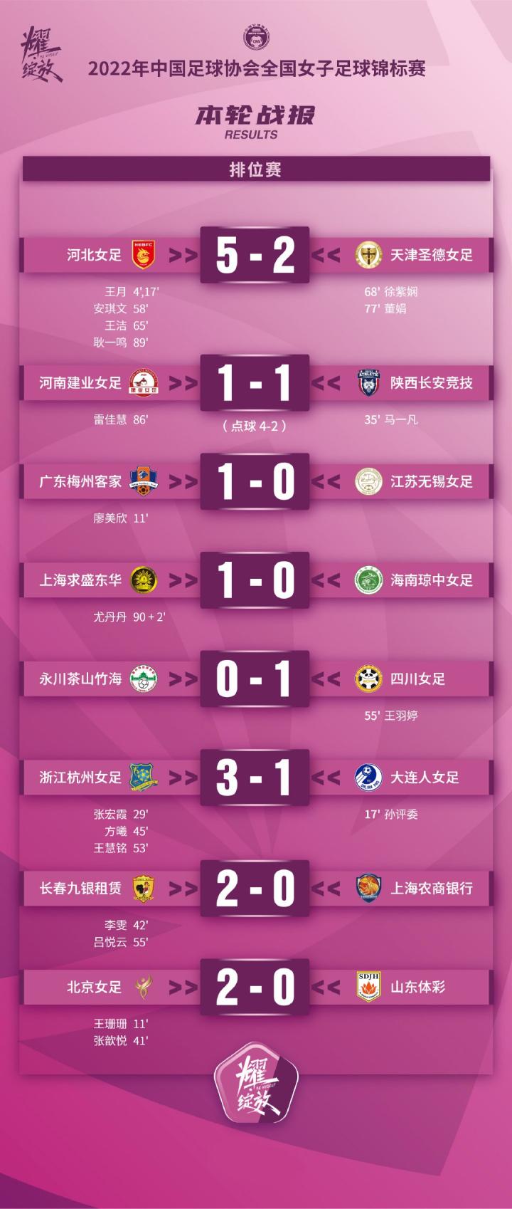 比赛开始不久,王月就完成梅开二度,下半场,安琪文、王洁、耿一鸣也纷纷取得进球;徐紫娴和董娟帮助天津扳回两球,但最终河北仍5-2大胜对手。
