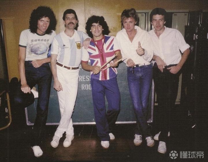 这张皇后乐队与迭戈·马拉多纳的合影是在1981年3月8日在布宜诺斯艾利斯的何塞·阿马尔菲塔尼球场(现萨斯菲尔德主场)后台拍摄的。 在当年,还没有哪个主流摇滚乐队曾经踏上过南美洲大陆。而皇后乐队的南美之旅第一站就选在阿根廷。 1976年至1983年期间,阿根廷处于军事独裁政府时期,据统计军政府当年屠杀了近三万平民和左翼人士。尽管鼓手罗杰·泰勒辩解道:“去这样的国家是‘为当地的人民而演出’”。但是这样的行为还是让皇后乐队名誉受损。 皇后乐队造访了三座1978年世界杯体育场,并在八天内进行了五场演出。1981年3月8日,他们在布宜诺斯艾利斯的阿玛尔菲塔尼球场迎来了阿根廷站的谢幕演出。在后台,皇后乐队见到了阿根廷最伟大的足球明星——马拉多纳。于是有了那张合影。马拉多纳身穿布莱恩·梅的英国国旗衬衫,弗雷迪·墨丘里则身穿迭戈·马拉多纳的阿根廷10号球衣。 据一位记者回忆,当墨丘里在一次烤肉派对上宣布自己将身穿阿根廷球衣表演时,在场的阿根廷人都极力劝阻他。在当时的阿根廷,摇滚和足球没有任何交集。但墨丘利希望将这两种激情汇聚在一起,所以他无视警告。 《号角报》称:“这是足球与摇滚浪漫史的第一章,也是第一次有国外音乐人身穿国家队队服登台演出。” 当晚,墨丘里还邀请迭戈·马拉多纳上台,介绍他们的安可曲目《Another One Bites The Dust》。当时留着长长卷发,穿着天蓝色球衣的马拉多纳缓缓跑到舞台中央,对观众们说:“我要感谢弗雷迪和皇后乐队让我这么开心。而现在,让我们聆听《Another One Bites The Dust》。”当这些照片公示于众,马拉多纳因穿着英国国旗衣服而受到阿根廷人民的严厉批评,他为自己辩解说,这些照片是在在战争开始前一年拍下的。 那一刻定格变成了一张永恒的明信片。因为仅仅一年之后,马岛战争爆发让阿根廷人与英格兰人针锋相对......当然这与音乐、足球无关。(转自zhihu)