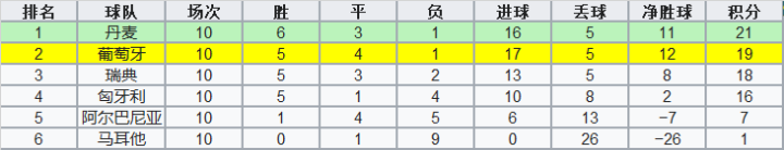 最终,葡萄牙在10场比赛中取得了5胜4平1负积19分的成绩,以1分优势击败瑞典排名小组第2,获得了参加附加赛的资格。