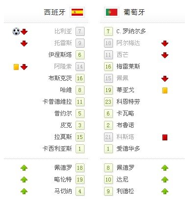 葡萄牙0-1西班牙双方首发