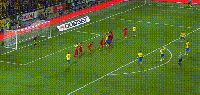 比赛第68分钟,瑞典通过进攻获得角球机会,卡尔斯特伦在右侧开出的角球准确找到了拥有身高优势的伊布,这位瑞典高塔力压布鲁诺·阿尔维斯将皮球顶入远角;仅仅4分钟后,伊布被布鲁诺·阿尔维斯放倒,他在大禁区线附近主罚的任意球低射钻进左下角,瑞典将总比分扳成2:2!
