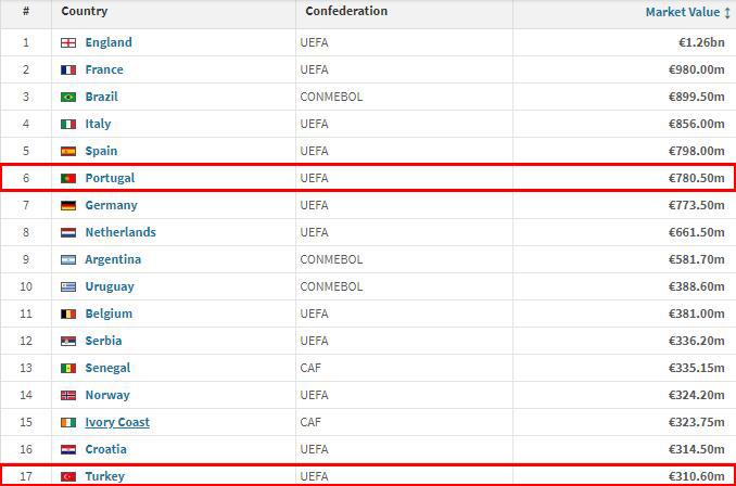 从世界排名来看,葡萄牙目前排名世界第8,而土耳其排名世界第39。从身价对比来看,双方的差距同样明显:葡萄牙目前全队总身价达到了7.8亿欧元,排名世界第6位;土耳其全队总身价只有3.1亿欧元,还不到葡萄牙的一半,排名世界第17位。