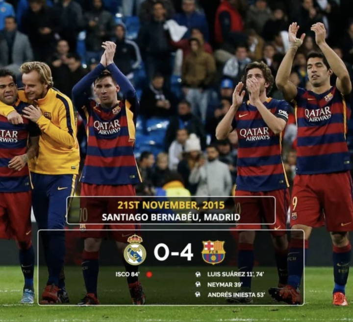 除了梦三巴萨的巅峰时期,过去十年巴萨还有两次净胜皇马4球。2015年11月21日的西甲比赛,梅西没有首发出战,但巴萨有苏亚雷斯梅开二度开杀戒,内马尔与伊涅斯塔也先后进球,最终帮助红蓝军团4比0客场取胜——那场比赛也是今天凌晨之前,巴萨最后一次客场净胜皇马4球。