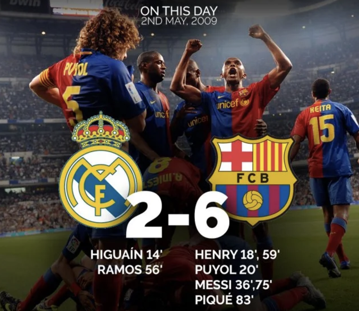 让人印象深刻的有2008/09赛季的那场6比2,同样是在伯纳乌,本泽马也同样缺阵,伊瓜因在第14分钟率先为皇马取得进球,结果亨利、普约尔和梅西上半场就将比分变成了3比1。下半场比赛,行云流水的巴萨丝毫没有收手,亨利和梅西纷纷梅开二度,皮克也锦上添花,拉莫斯的进球显得毫无意义,一场2比6,成为皇马在伯纳乌的永恒之耻。
