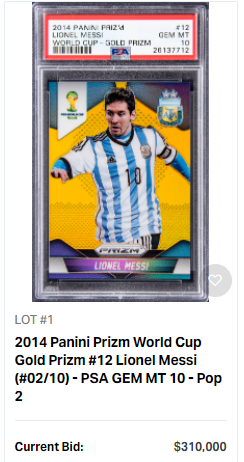 近日知名拍卖平台Goldin auction上架了一张2014年巴西世界杯梅西PSA评级为10分的PRIZM系列球星卡。7次金球奖得主梅西带领阿根廷队挺进2014年世界杯决赛,攻入4球,并获得世界杯最佳球员金球奖。本次拍卖的截标时间是2022年4月10日,目前最高出价已经来到了310000美元。相信截拍时成交价又是一个天价。