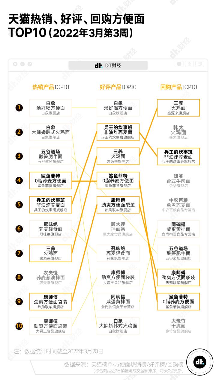 不过,白象并不是上榜单品最多的品牌。传统方便面巨头康师傅和韩国品牌三养均占据榜单3个席位,另一方便面巨头统一也在榜单中凭借汤达人系列泡面出现2次。