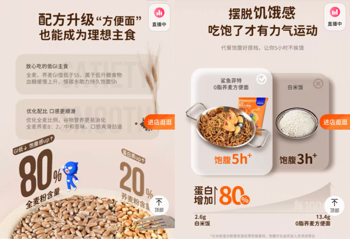荞麦面在热销榜、好评榜和回购榜中都取得了好成绩。“非油炸”“低脂”“全麦”“低卡”的荞麦面,不仅满足了当代人对健康的需求,还成为了年轻人的保持身材的“利器”。