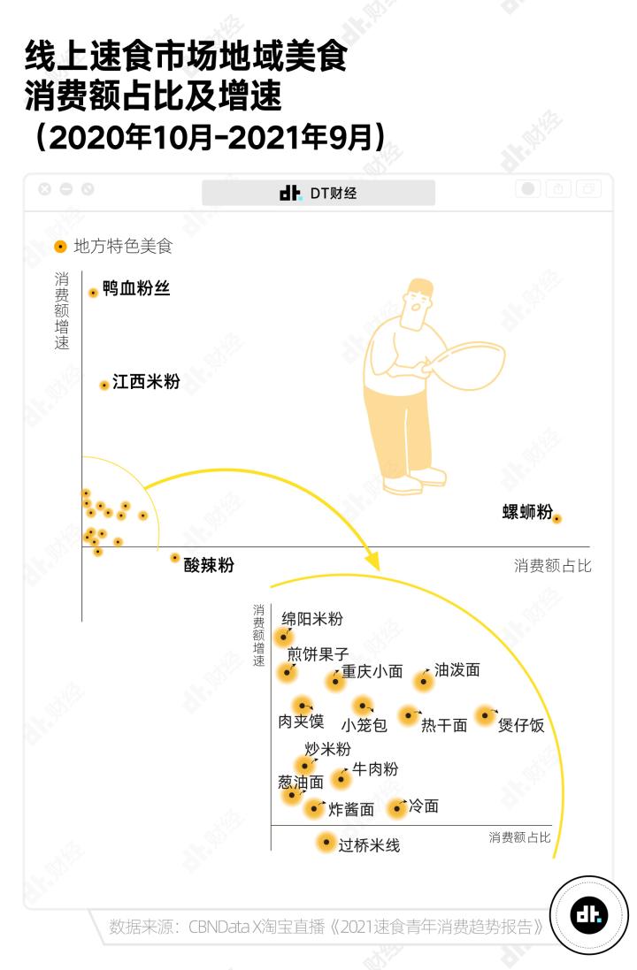 根据CBNData发布的《2021方便速食行业洞察报告》,除了已经占据市场大头的螺蛳粉,近年来也涌现出不少增长迅速的地域美食,例如鸭血粉丝、江西米粉等等。各地美食那么多,即使不便动身旅游,也能在家尝试点新鲜口感。