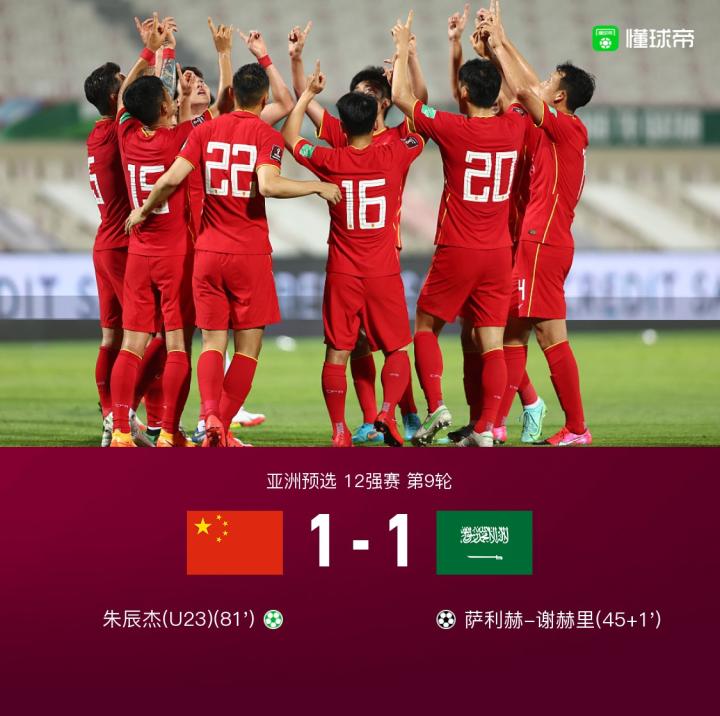 第81分钟,高准翼右路传中,金敬道头球抢点,阿卜杜拉-阿姆里躲闪不及手球送点,朱辰杰点射破门!国足1-1沙特!