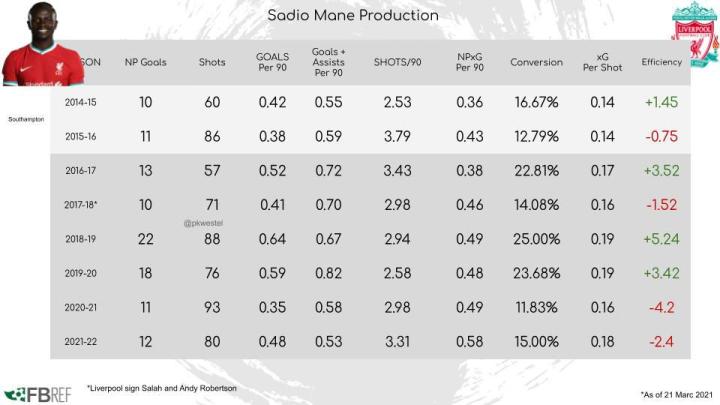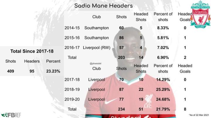 马内在英格兰足坛的头三年里,仅有6.9%的射门是头球。接下来的三个赛季里,这一比例跃升至21.79%。