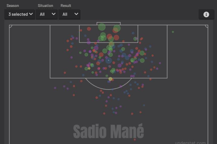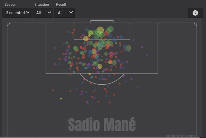 第二张图的射门分布就稳定多了,也更集中于禁区中路。不只是射门次数减少了,马内还优化了自己的射门选择,减少了得分可能性不高的射门次数,提高了机会不错的射门次数。