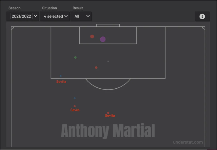 单看拉什福德这张图,似乎没啥问题,但你再看看马夏尔的,就会注意到法国人的射门更集中于中路。