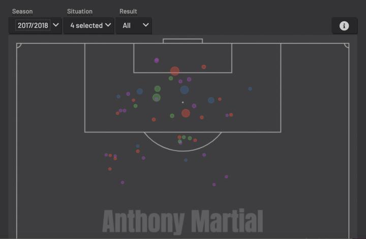一年后,马夏尔仍在左路,仍能出色地游弋到中路威胁对方大门。尤其值得一提的是,尽管只踢了18场比赛,马夏尔在6码区内完成了5次射门(总计1621分钟,平均每90分钟0.28次)。