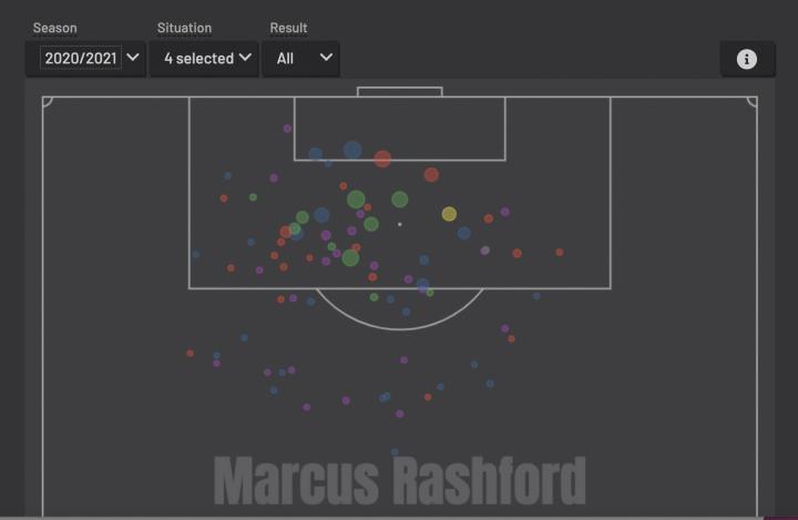 拉什福德大半个赛季都是踢的中锋位置,仅在6码区内完成了7次射门。