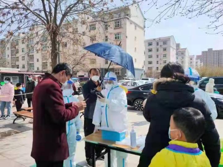 有一天,由于室外光线太强,工作人员有时扫不上居民市民码。王勇看到后,立马回家取来一把伞,用右胳膊举着,撑在工作人员的头上,一撑就是两个多小时。