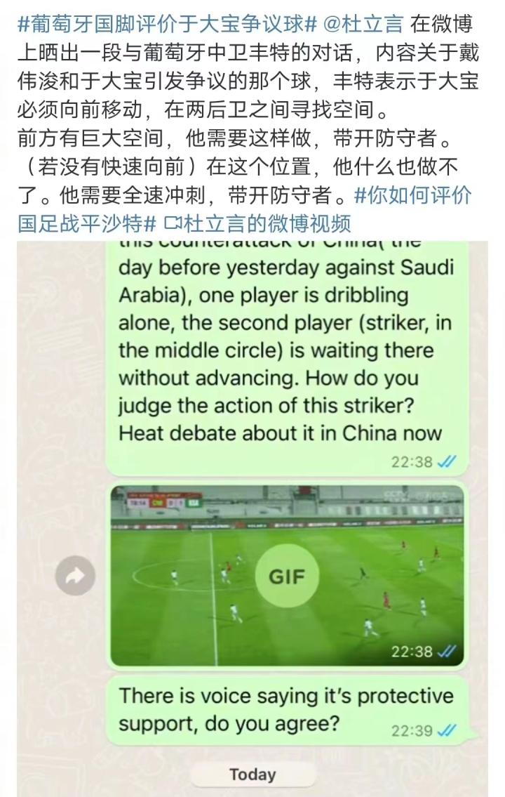 为了验证于大宝没有前插是否正确,我们甚至不惜向世界名帅卡罗和孔特拉求证,又辗转联系了C罗队友、葡萄牙国脚丰特!哈哈,什么时候我们对国足这么上心了?要是早这样,不早就冲出亚洲,走向世界了?!呵呵,费了老鼻子劲向世界名帅求证的人,是为男足好吗?这是为了验证打嘴仗谁对谁错罢了。