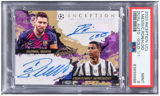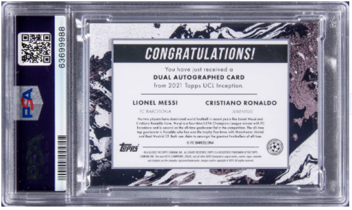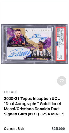近日,知名体育收藏拍卖网站Goldin Auctions上架了梅西和C罗的双签球星卡,梅西和C罗在这张独特的Topps Inception UCL Dual Autographs Gold球星卡上分别签署了自己的名字。PSA给予这张球星卡的评级分数为9,限量版序列号为“1/1”。凭借12座金球奖奖杯,梅西和C罗定义了21世纪的足球。目前这张卡片的出价达到了35000美元,截拍的时间是2022年4月10日。