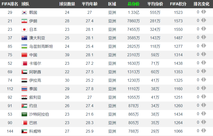 日本队的总身价排在伊朗队之后,但是日本队的平均身价(324万欧元)要高于伊朗队(281万欧元)的平均身价。