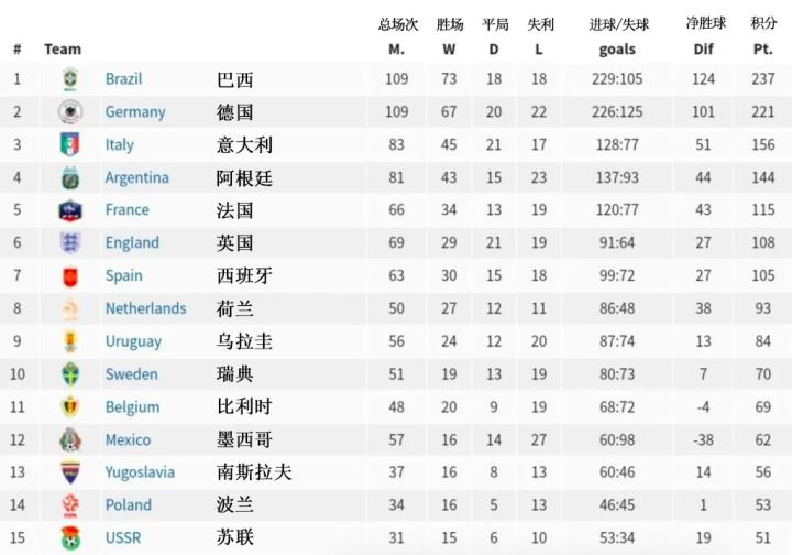 巴西的记录确实令人印象深刻,德国当然也不差。赢得四次世界杯的德国队目前领先第三名的意大利队65分。