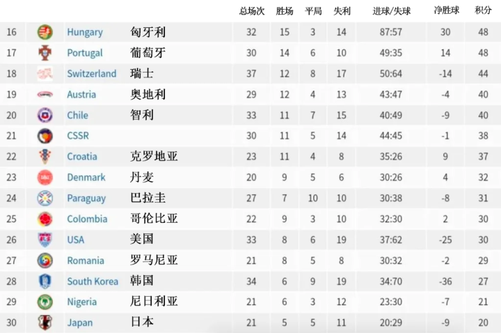 令人惊讶的是,葡萄牙在世界杯上的战绩仅够排在第17位,落后于波兰、墨西哥和匈牙利等国。