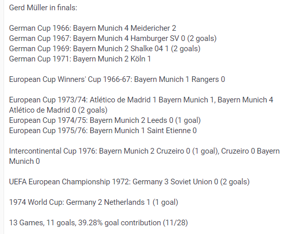 盖德-穆勒生涯决赛数据:13场11球。盖德-穆勒的决赛数据,并没有助攻统计,作为一名超级射手,进球才是他最大的本事。让我们来看看穆勒的决赛进球能力有多强吧,德国杯决赛4场4球,欧冠决赛3场3球,洲际杯2场1球,欧洲杯决赛1场2球,世界杯决赛1场1球,穆勒参加所有赛事的决赛中,只有1966-67赛季对阵流浪者的优胜者杯决赛没有进球,其他赛事决赛均有进球(并不是每场)。