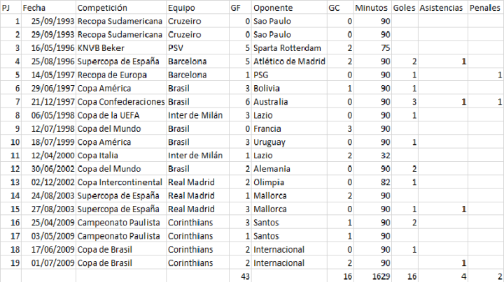 虽然“现象”生涯决赛进球效率并不像普斯卡什和贝利那么高,但大罗绝对是名副其实的足坛历史决赛之王。在国家队层面,罗纳尔多是唯一世界杯、美洲杯和联合会杯决赛都有进球的男人,不仅如此,俱乐部生涯大罗在决赛中也是进球如麻。巴西杯、荷兰杯、意大利杯、国王杯、欧洲超级杯、洲际杯和联盟杯决赛上,都有进球。除了1998年世界杯决赛,大罗几乎在自己参加的所有决赛中都有进球。