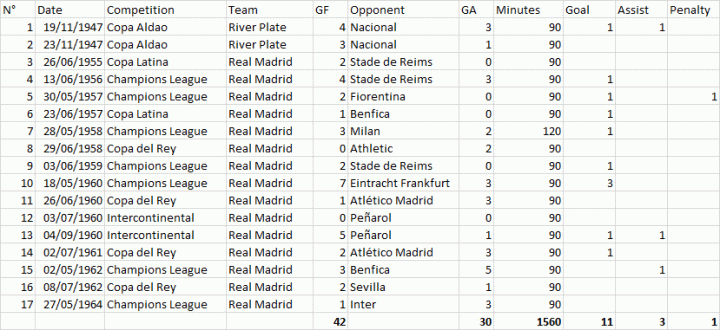 迪斯蒂法诺生涯决赛数据:17场11球3助攻。