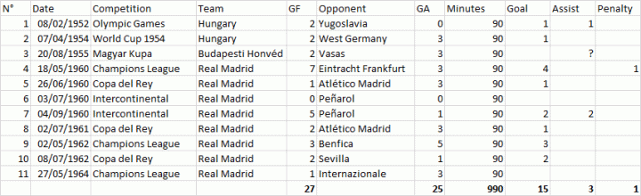 此外普斯卡什还曾在1960年对阵乌拉圭球队佩纳罗尔的洲际杯第二回合中,打进2球并送出2次助攻。
