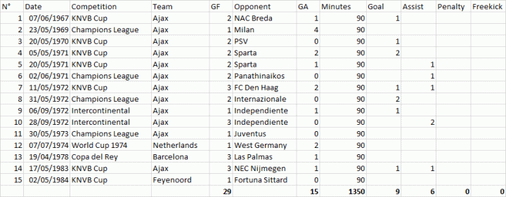 克鲁伊夫生涯决赛数据:15场9球6助攻。欧冠三连冠时期,克圣在1971年决赛对阵帕纳辛奈科斯第87分钟助攻队友、前国足主帅阿里-汉打进球队第二球锁定胜局。1972年决赛2-0战胜国米,克鲁伊夫包办了两个进球。此外,克圣还参加了1974年的世界杯决赛。