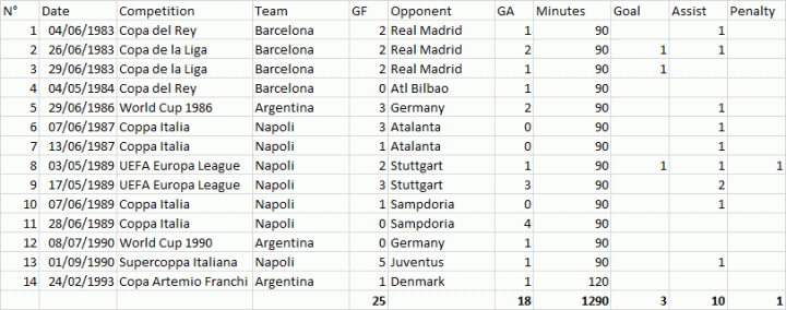 马拉多纳生涯决赛数据:14场3球10助攻。