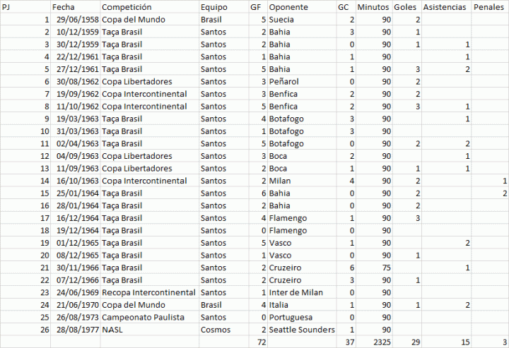 贝利生涯决赛数据:26场29球15助攻。
