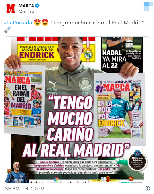 他正在被所有你们能想到的欧洲豪门所追求。在过去的一个月里,他已经在马卡报的头版上登场了至少三次,其中有一次特别玄妙:他举起了之前两次登上封面的照片。你们或许曾看过他在1月份的一个进球,对阵欧斯特的比赛中那个超级倒钩让他迅速走红。莱茵克尔专门发推,表示对恩德里克天赋的赞美。
