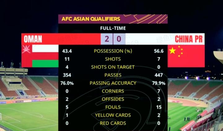 【国足vs阿曼全场数据:射门7-11,射正0-4,角球7-0】