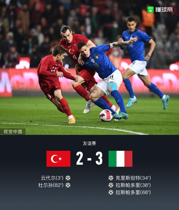 【意大利3-2土耳其,拉斯帕多里双响,克里斯坦特、云代尔破门】