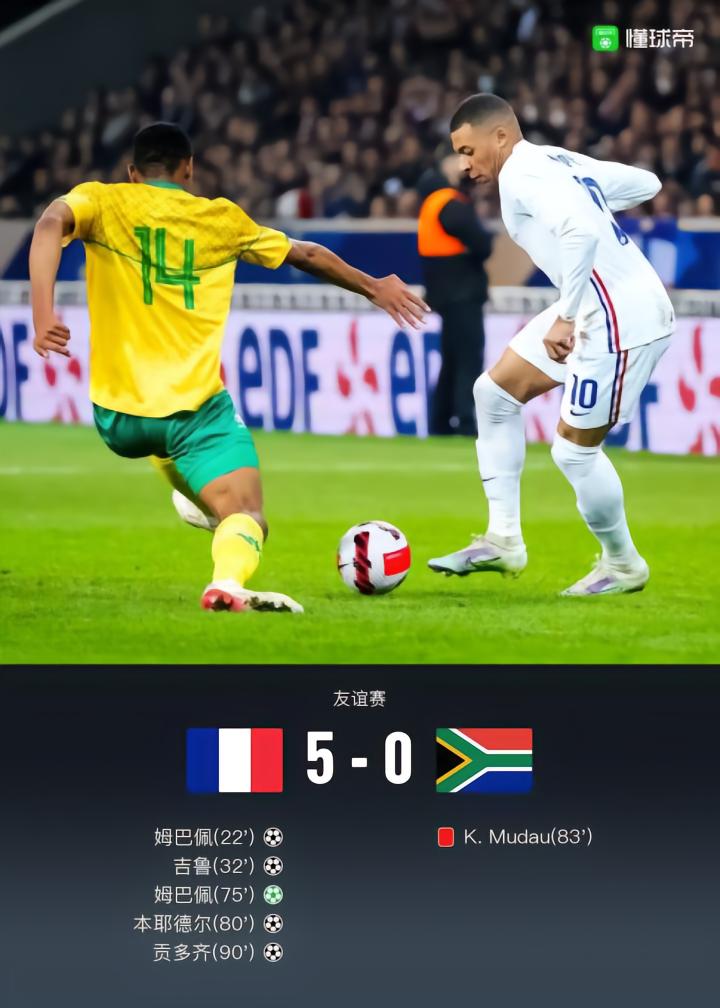 【法国5-0南非,姆巴佩两射一传,吉鲁破门,格列兹曼两助攻】