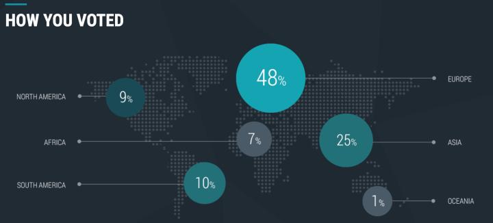 根据欧足联官网提供的数据,此次投票活动收到的选票遍布全球,其中48%的选票来自欧洲,是参选人数最多的大洲。亚洲排名第二,投票占比25%。