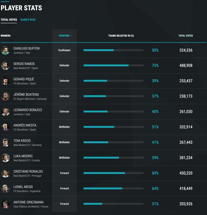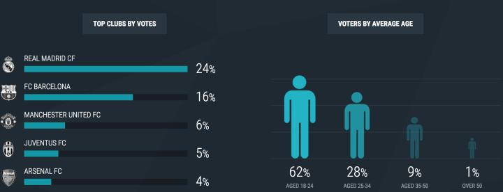 根据数据,皇马是获得票数最多的俱乐部;有62%的选票由18-24岁的用户投出。