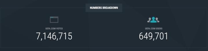 选票数也创了新高:共有64万9701名欧足联官网用户参与了投票,总票数为714万6715张。