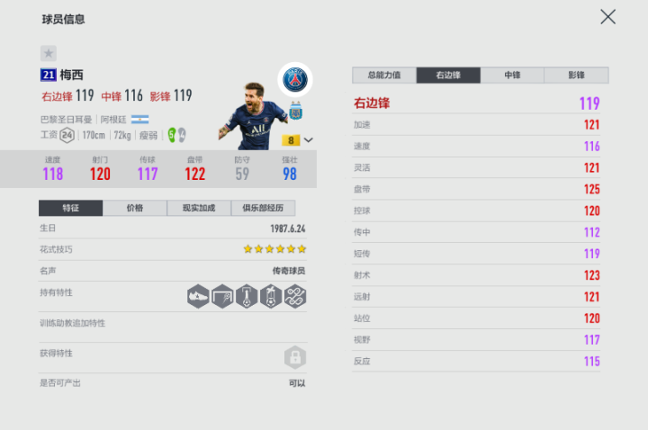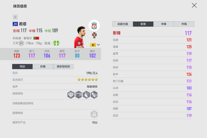 关键属性(满加成):射术133、射门弧线136、盘带135、平衡134