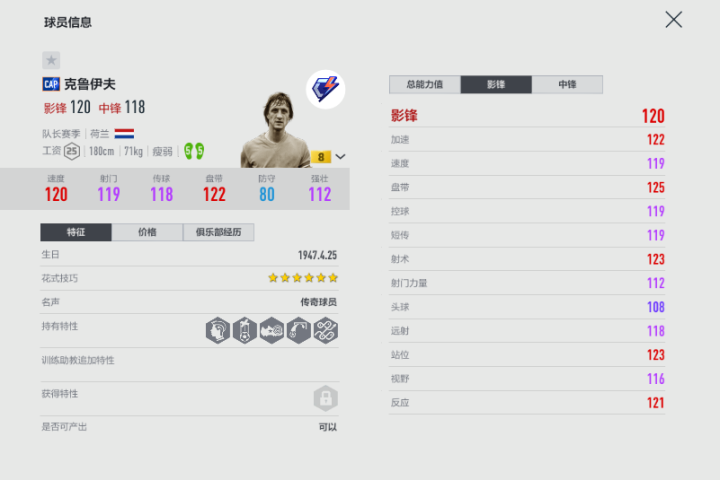 随着CAP卡包的放出,荷兰传奇名宿克鲁伊夫也已经降到了合适的入手价格,金卡总评可以达到130,而且属性相当全面,没有短板。他在前场可以用无所不能来形容,136的射门弧线加上双五脚能够让他在三十米开外直接一脚远射洞穿对手的大门,而且相比较同类型球员,他最大的优势还是在于比较出色的反应和积极性,很多人会忽视他的抢二分之一球能力,虽然很难像古利特、齐达内那样兼备模型与手感,但事实上无论是120的强壮还是130的侵略性,都能够使他在无形之中取得身位上的优势,减少对手后卫的干扰。而克鲁伊夫的手感优势主要在于相较而言,因为没有快速带球特性,他在边路的跑动能力并不算最顶尖的那一档,但拉边之后的传中非常精准,因此,还是建议把他放在前腰甚至中锋的位置上,通过出色的传控球能力撕扯对手防线。