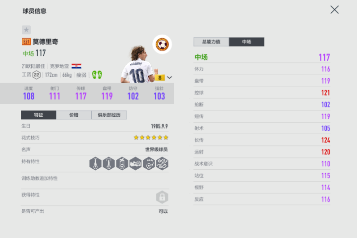 技术型中场的代表球员莫德里奇毫无疑问是游戏中“细腻”的代名词,虽然身高只有1米72,也是瘦弱模型,在球场上显得有些“娇小”,不过从实战手感而言莫德里奇绝对是数一数二的中场,哪怕是在这个注重身体对抗与奔跑速度的游戏,他依旧有着很可观的出场率,这主要是由于他在球场上的灵性以及超高传球精准度所带来的。直塞为王的游戏版本对中场的手感要求很高,而莫德里奇无论是背身拿球、带球的步频还是一脚出球找到前插队友的脚法,都堪称中场的典范。而满星花式以及130的远射能力,让他在进攻端也能够有所收获,双五脚的他实测无论左脚还是右脚的30米搓射,都相当有威胁,是球队在打不开局面的有效进攻手段。