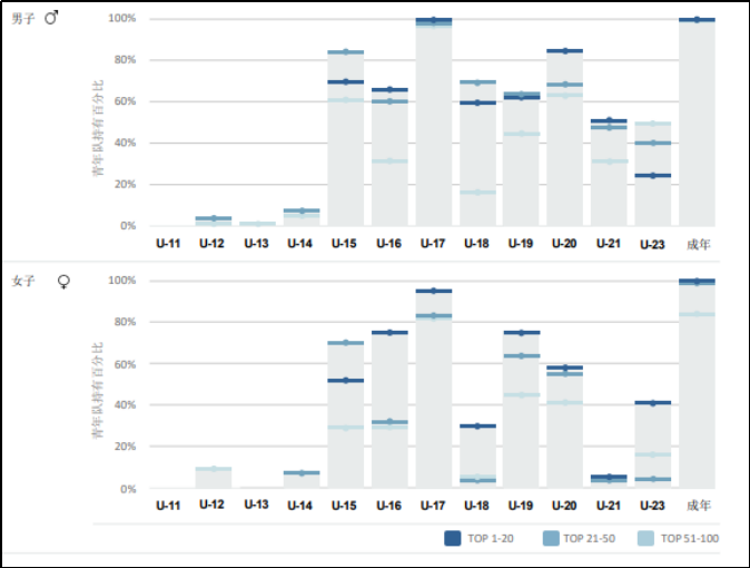 下图为全球前100名国家队拥有各级青年队的比例,排名前20的国家比例高于其他国家,我们的近邻日本目前也已经完成了男子队伍U15至U21的全年龄建制。