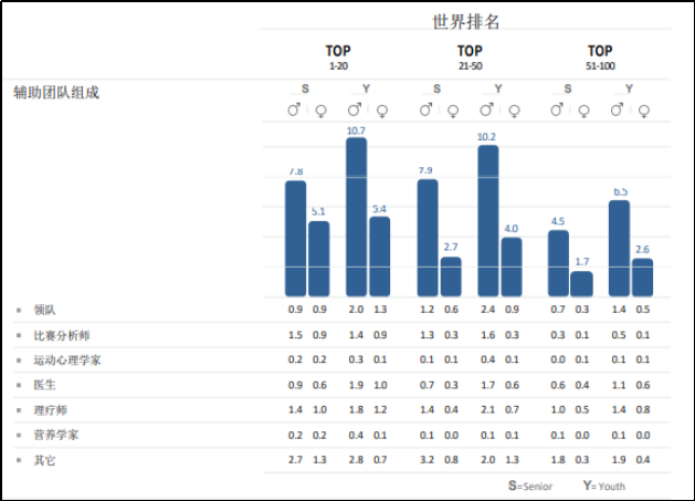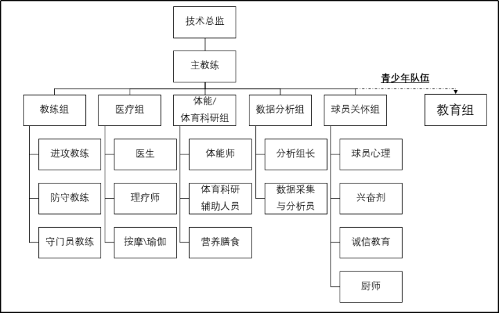 根据《足球生态报告》分析全球趋势,在主教练管理的队伍层面,如下图所示,多分为五个小组,分别为:教练组、医疗组、体能组、数据分析组和球员关怀组,青少年队伍多增加一个教育组。