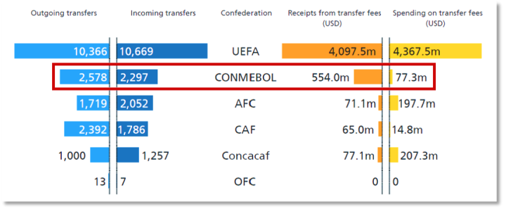 而经济发展水平明显落后于欧洲、北美,以巴西、阿根廷、乌拉圭、和哥伦比亚为代表的南美洲足球强国却仍排名世界前20位,又是为什么呢?篇幅所限不展开深入分析,但只从最新《国际足联全球转会报告》来看,南美洲是仅次于欧洲的转会球员来源国,南美洲球员主要转会目的地便是欧洲各大联赛。