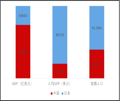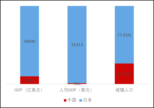 近三十年来,中国已经扭转了工业化全面落后日本局面,在工业门类、整体工业规模方面都超过日本,人均GDP和城镇人口占比都显著上升。