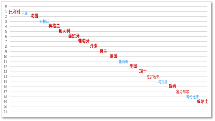 以最近的国际足联男足国家队排名来看,前20名中,13个国家队来自工业化发达经济体,除了传统西欧国家外,来自北美的美国和北欧的瑞典分别位列13名和17名。