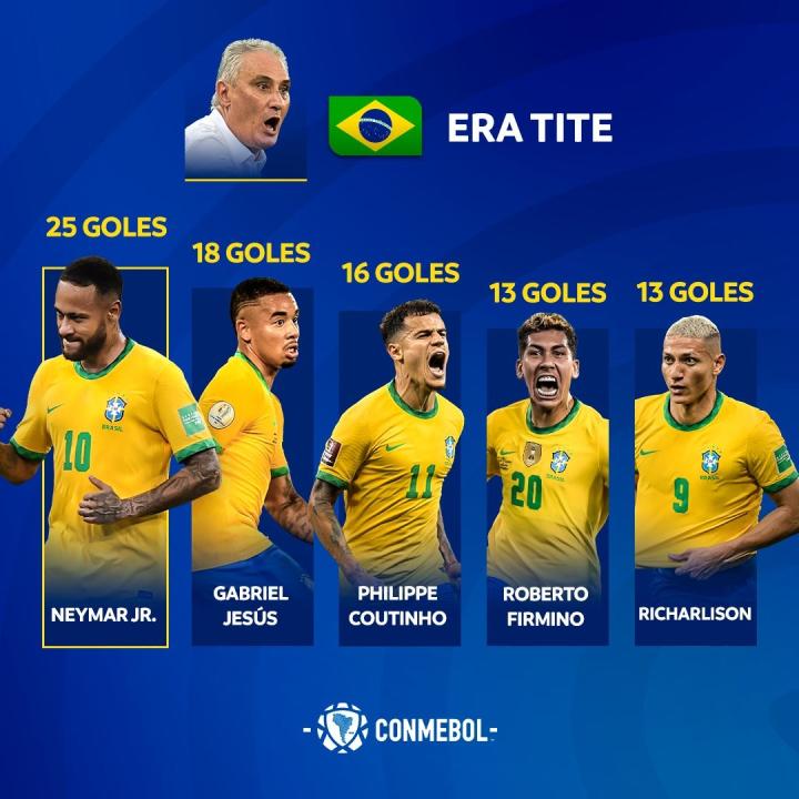 据南美足联官方统计,自蒂特上任以来,内马尔是巴西国家队进球最多的球员,一共打入25球,热苏斯排名第二,库蒂尼奥位列第三。