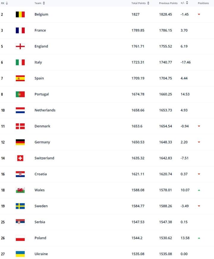 欧洲范围内,排名前16的球队分别是比利时(世界排名第2)、法国(世界排名第3)、英格兰(世界排名第5)、意大利(世界排名第6)、西班牙(世界排名第7)、葡萄牙(世界排名第8)、荷兰(世界排名第10)、丹麦(世界排名第11)、德国(世界排名第12)、瑞士(世界排名第14)、克罗地亚(世界排名第16)、威尔士(世界排名第18)、瑞典(世界排名第19)、塞尔维亚(世界排名第25)、波兰(世界排名第26)、乌克兰(世界排名第27)。