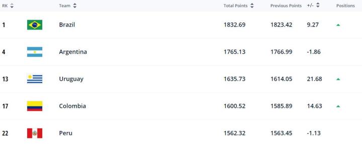在南美洲方面,排名前5的球队分别是巴西(世界排名第1)、阿根廷(世界排名第4)、乌拉圭(世界排名第13)、哥伦比亚(世界排名第17)、秘鲁(世界排名第22)。
